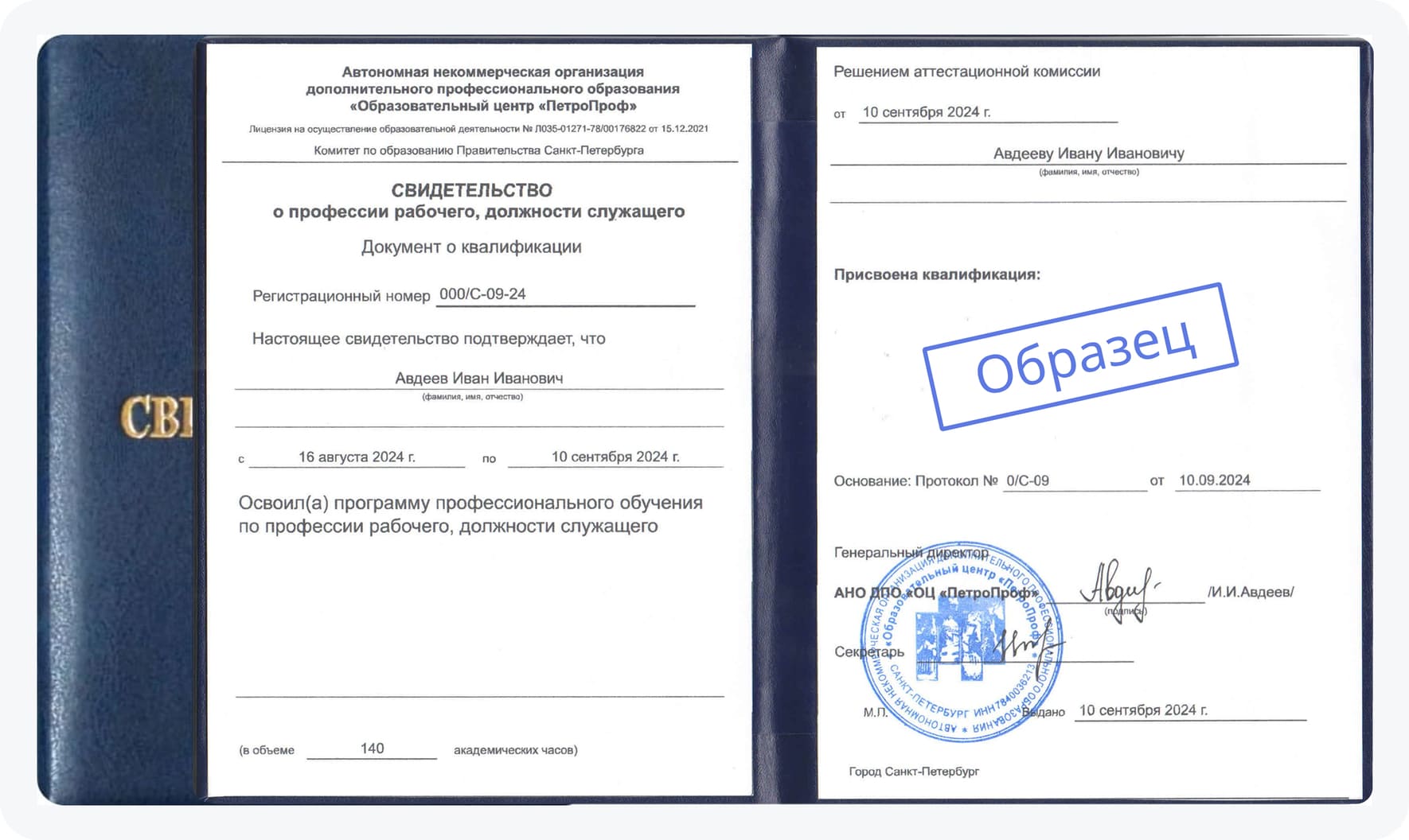 После успешной аттестации вы получите свидетельство о получении рабочей профессии или удостоверение, подтверждённое образовательной организацией.